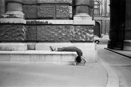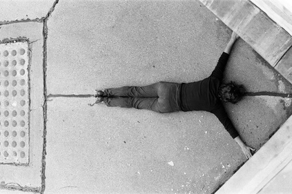 Körperlichkeit und medialer Darstellung. VALIE EXPORT liegt rücklings am Boden. Man hört