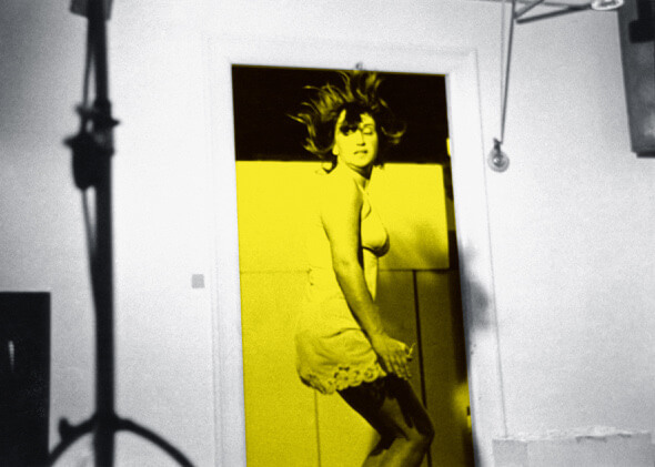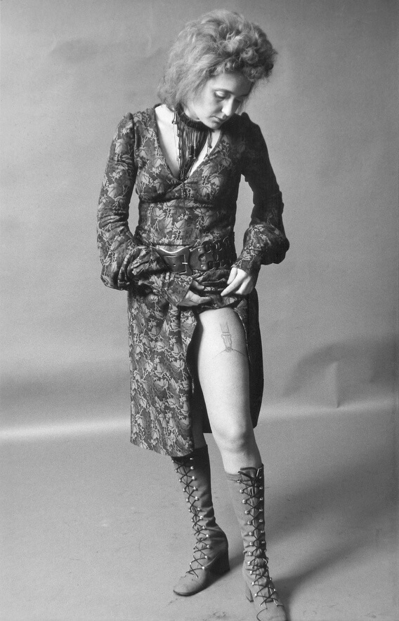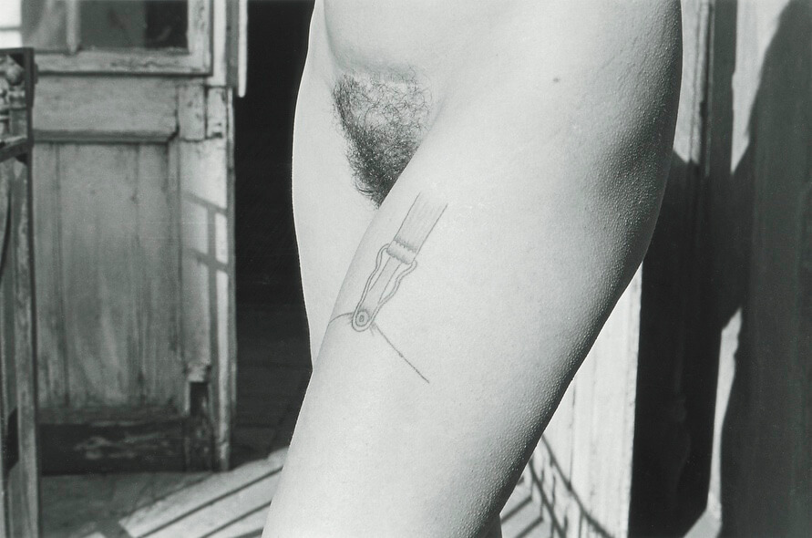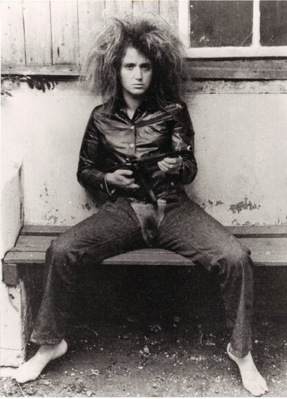 The GENITAL PANIC art action first took place in a movie theater in Munich in April 1969. Wearing a crotchless pair of jeans that left her genitalia uncovered, the artist sidled through the rows of seats, her exposed genitals at the eye -level of the movie audience. Some time later, she had Peter Hassmann take a series of photographs of herself wearing those same pants and holding a submachine gun in her hands; the pictures are -entitled ACTION PANTS: GENITAL PANIC. With her radical art action in the movie theater, VALIE EXPORT wanted to criticize the objectification of the female body by the media. The weapon was added only in the photographs to signal the urgency of the issue and the feminist willingness to fight.
