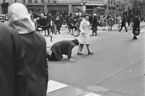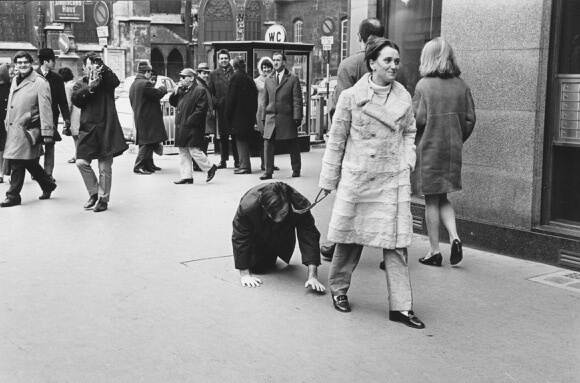 street to put their hands into a box mounted on her upper body and touch her breasts,
