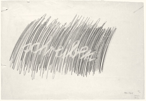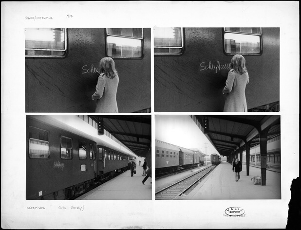 Aside from the body, language has been VALIE EXPORT’s preferred medium since the 1970s. The works presented at Kunsthaus Blaue Butter are a case in point. For her piece SCHRIFTZUG WIEN–VENEDIG of 1973, for example, the artist wrote the word “Schriftzug” on a railway train. Not only does she play with the multiple meanings of the German word “Zug” here (signifying a railway train as well as a stroke of script) but she also refers to the cultural and geographical background, to mobility, and a sense of belonging—doing all this through the simple act of writing and the work title. Writing and drawing also provide themes (and titles) for VALIE EXPORT’s drawings. They afford insights into the process of creating artworks with language. In the videos of her performing poems or “breath texts” in front of the camera, spoken language becomes an artistic medium: EXPORT breathes “I love you” onto a glass pane, her exhalation steams up the glass. The pane and the camera lens (and then the video screen) appear to be one and the same surface.